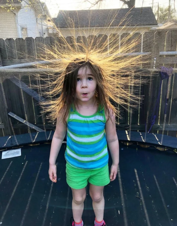 Эта фотография показывает девочку, которая полезла на батут, чтобы узнать, что такое статическое электричество, и создает забавную и необычную сцену.