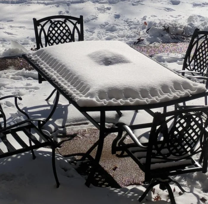На этой фотографии снег сам растаял и изогнулся по краям столешницы, создавая необычный эффект.