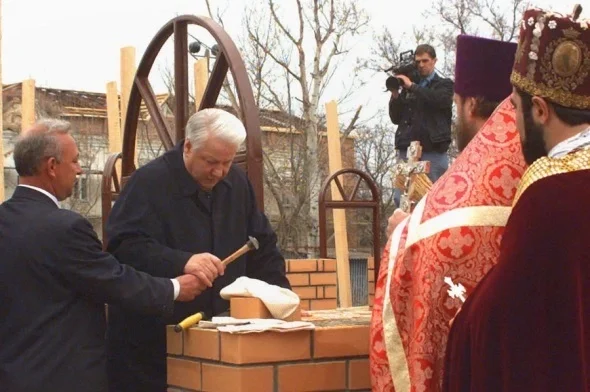 Борис Ельцин во время церемонии закладки камня часовни у буденновской больницы в память о жертвах теракта, 17 апреля 1996 года.