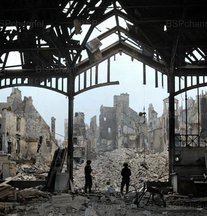 Вид на город Кан, разрушенный во время освободительной кампании союзников во Второй мировой войне, Франция, 1944 год.
