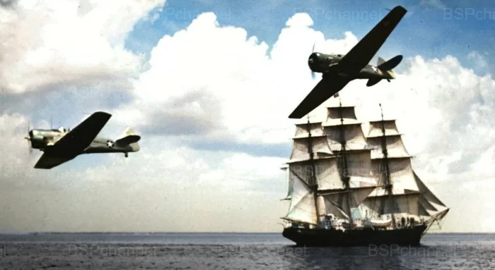 Американские самолёты пролетают возле парусника "Joseph Conrad" спущенного на воду в 1880 году. Фото 1942 года.