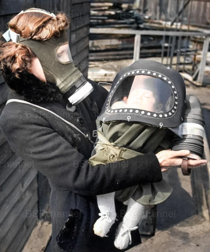 Жительница Лондона с ребенком во время испытания противогазов, 1941 год.