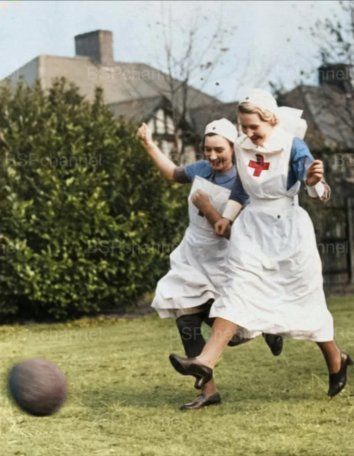 Медсестры больницы Св. Иоанна и Красного Креста из передвижного подразделения на территории госпиталя поддерживают форму в свободное время, организуя футбольные матчи. Вторая мировая война, Великобритания, 1 ноября 1939 года.