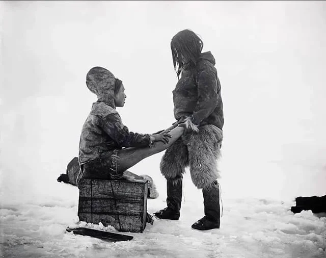 15. Мужчина из племени инуитов греет ноги своей жены, Гренландия, 1880-1890-е годы