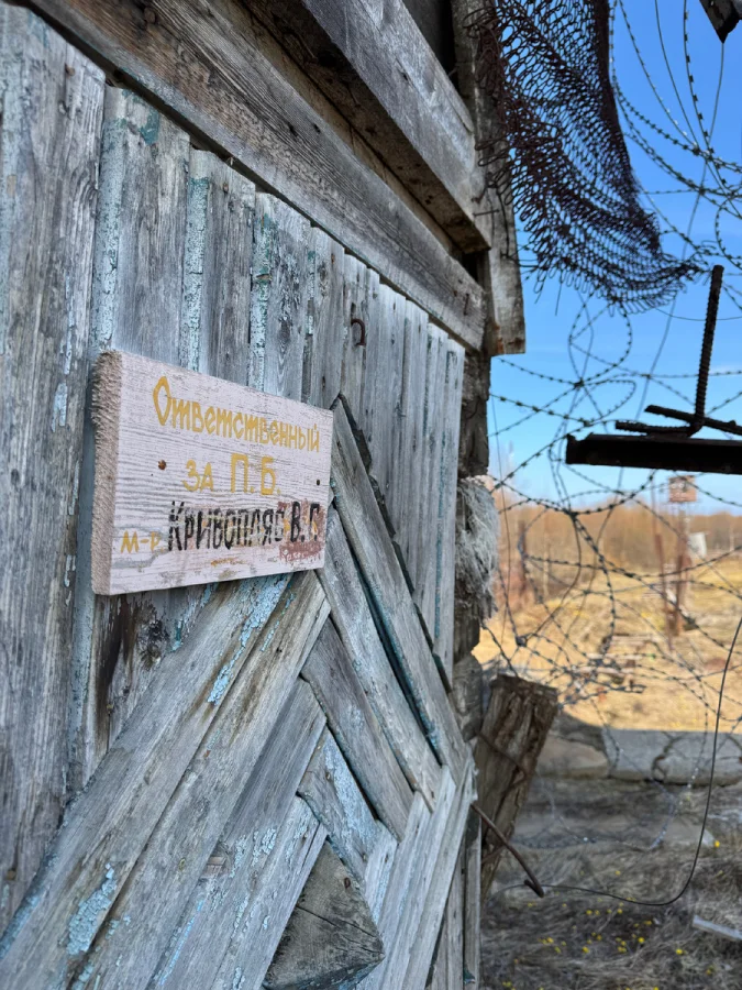 Однако намеки на прошлое видны уже на подходе к зданию. "Внимание! Режимная территория!" — гласит самодельный плакат, кратко предупреждая о последствиях для тех, кто нарушит строгие правила.