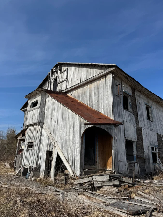 Первым нас встречает здание администрации. Оно выглядит как декорация к историческому фильму. Трудно поверить, что когда-то здесь кипела жизнь и решались судьбы людей.