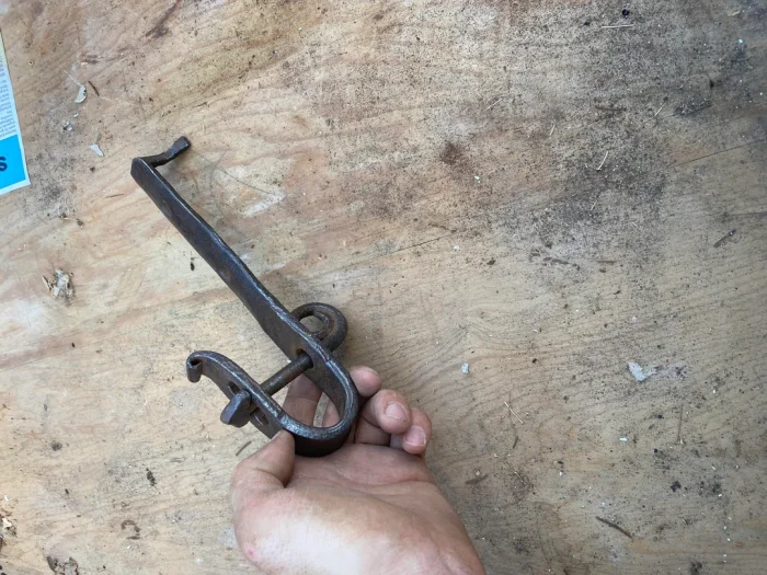 Это замок для ведра для колодца-журавля, чтобы ведро не улетело в колодец при наборе воды, если Логика работы - надели ведро, закрыли замок, набрали воды, открыли замок, забрали ведро.