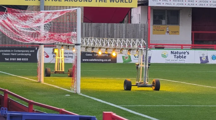 Это компактная система освещения на основе натриевых ламп высокого давления. Смысл - усиливает рост травы там, где мало солнца. А площадка перед воротами еще и вытаптывается сильнее, чем другая часть поля.