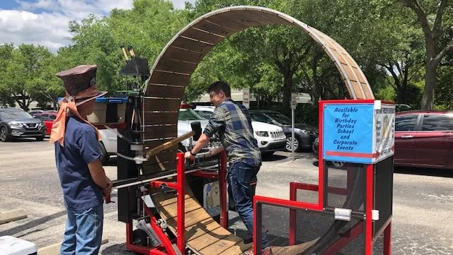 Это развлекательный аттракцион на ярмарках — огромное «колесо для хомяка», куда человек залезает и бежит внутри, а его движение через ремни или шестерни крутит ледодробилку для снеков.