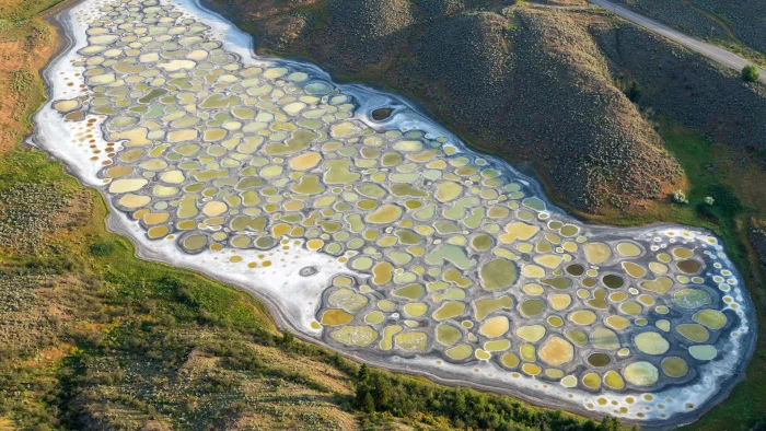 Этот уникальный водоём в Британской Колумбии насыщен минералами. Летом, когда вода испаряется, на дне озера образуются причудливые минеральные пятна разных цветов, напоминающие узоры на шкуре фантастического зверя. Затвердевая, они создают естественные дорожки и удивительные природные рисунки.