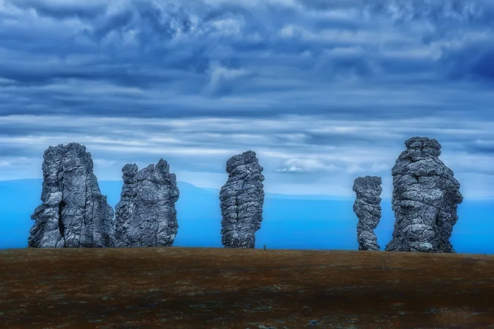 Эти семь гигантских каменных исполинов в Республике Коми создают поистине завораживающее зрелище. Шесть из них стоят группой, а седьмой – немного поодаль. Их причудливые формы напоминают то ли древних идолов, то ли фантастических существ. Один из столбов своей формой похож на перевёрнутую бутылку, будто вонзённую в землю неведомой силой.
