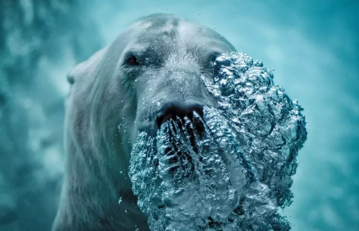 14. Фотография белого медведя, пускающего пузыри под водой