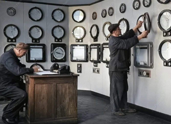 Один из пультов контроля Краснодарского нефтеперерабатывающего завода (ныне - "Краснодарский нефтеперерабатывающий завод – Краснодарэконефть"), 1964 год.