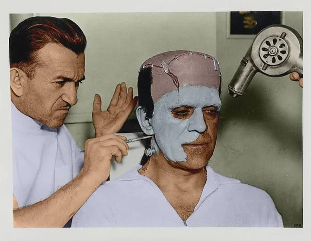 13. Мастер грима Джек Пирс работает над образом Бориса Карлоффа для фильма "Франкенштейн", 1931 год