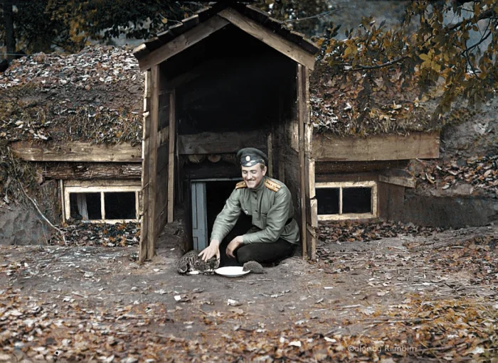 15. Русский офицер кормит кошку и ежа молоком во время передышки между боями, 1916 год