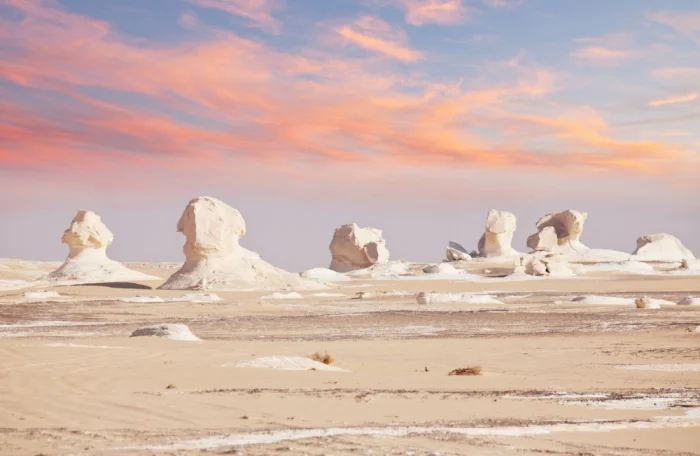 В самом сердце египетской Сахары раскинулась Белая пустыня — удивительное место, где ветер и время создали причудливый каменный лес из меловых скал. Ослепительно-белые образования причудливых форм контрастируют с золотистыми дюнами, создавая впечатление инопланетного пейзажа. Эти скалы, некогда бывшие дном древнего океана, хранят в себе следы далёкого прошлого.