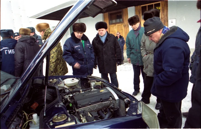 18. Посетители знакомятся с новым двигателем автомобиля "Москвич", 2000 год