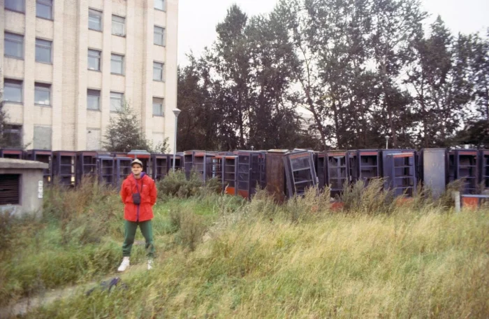 17. Турист из Европы с большим удовольствием позирует на фоне "кладбища" телефонных будок на углу улицы Гидротехников и Гражданского проспекта