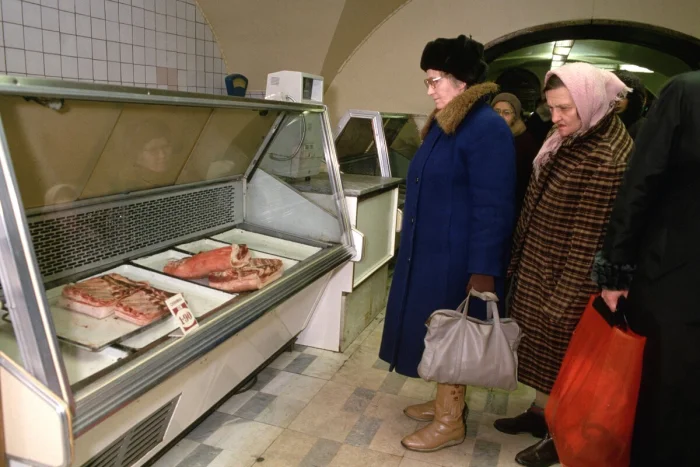 19. Женщины смотрят на мясное "изобилие" в гастрономе на улице Желябова (ныне - Большая Конюшенная)