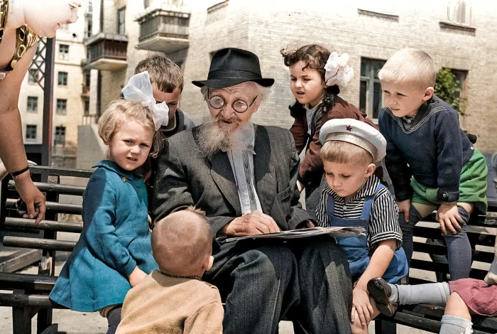 104-летний участник Русско-турецкой войны 1877–1878 годов Фёдор Иванович Таранов с 4-летними обитателями дома № 170 по ул. Красноармейской, Киев, июнь 1959 года.