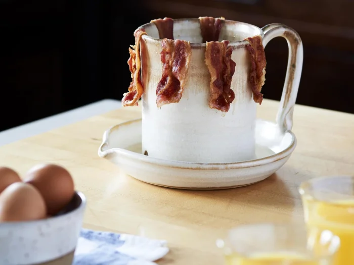 Это приспособление для приготовления бекона в микроволновой печи. Ломтики мяса размещаются по краям чашки, а жир стекает через отверстие вниз, после чего его можно аккуратно слить через носик на блюдце.