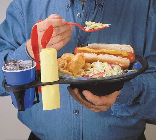 Это удобный держатель для бумажной посуды на вечеринках — одновременно фиксирует тарелку и стакан или бутылку.