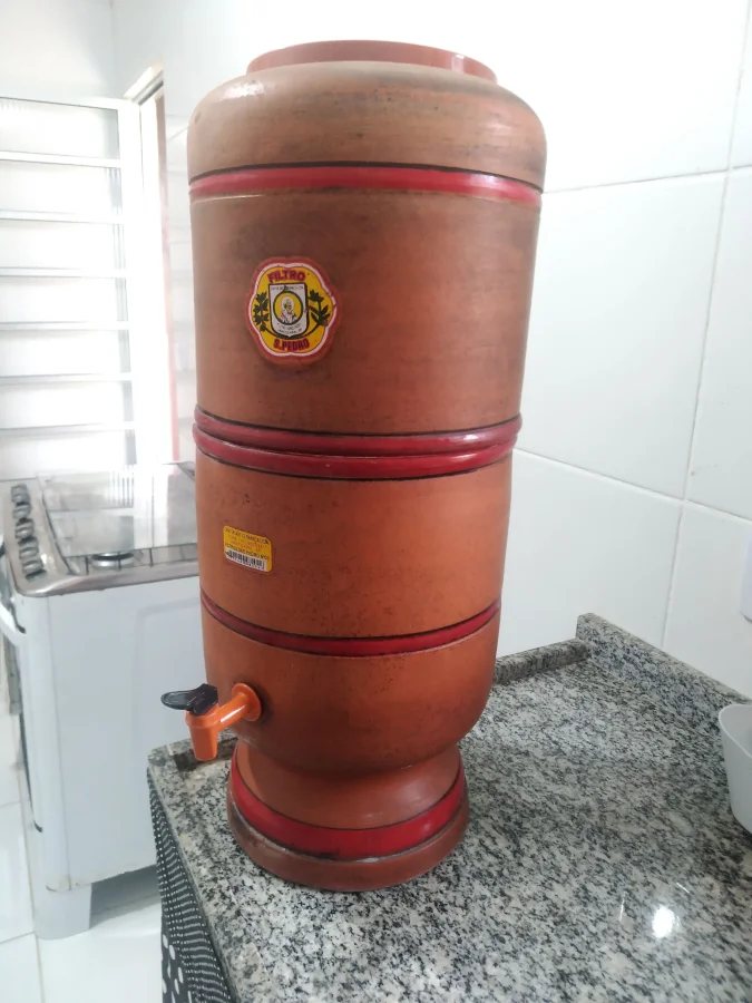 Традиционный глиняный фильтр для воды, широко распространённый в Бразилии. Керамика эффективно задерживает механические примеси, а серебряное покрытие дополнительно обеззараживает воду.
