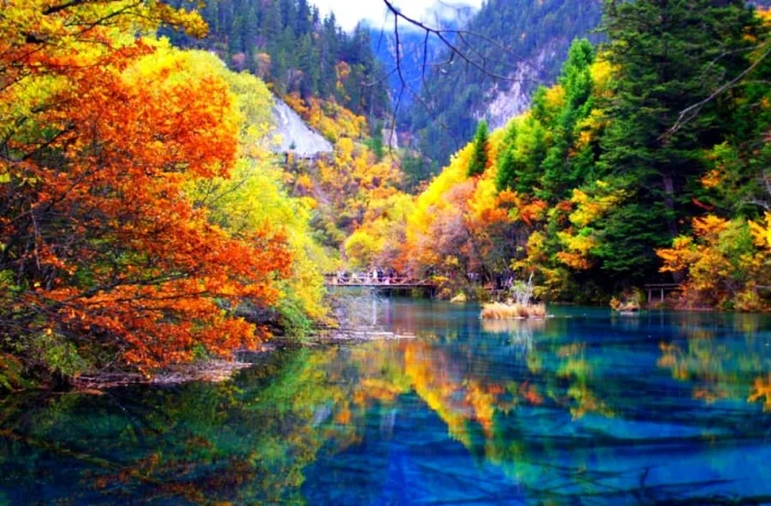 6. Китайское Озеро Пяти Цветков в национальном парке Цзючжайгоу волшебным образом меняет свою окраску от прозрачно-голубой до тёмно-зелёной и насыщенно-синей
