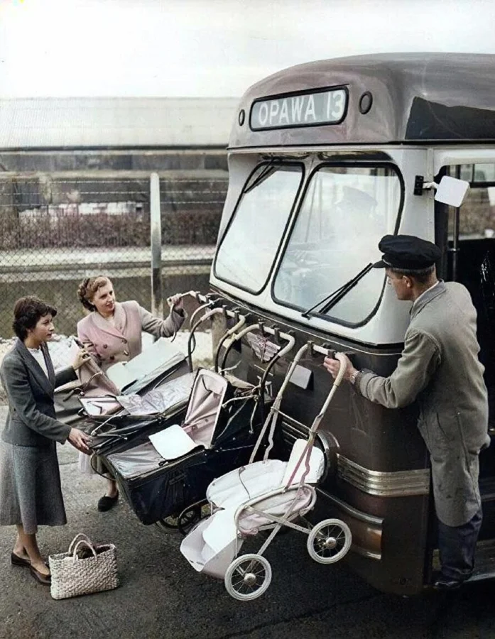 Специальные крючки для колясок на рейсовых автобусах Новой Зеландии в 1950-х годах