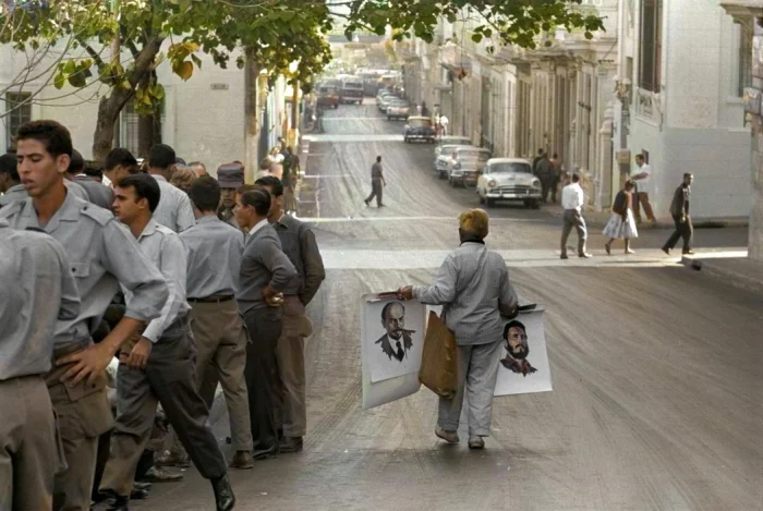 Мужчина продает плакаты Ленина и Фиделя Кастро перед зданием Гаванского университета. Куба, 1964 год