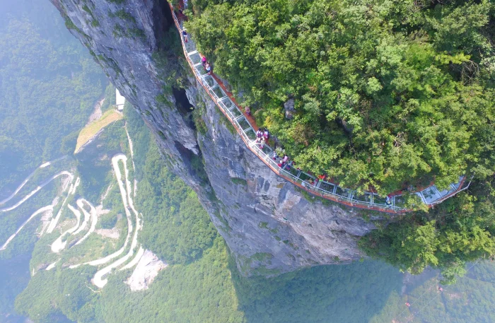 На высоте 1430 метров над уровнем моря по крутой скале горы Тяньмэнь («Врата небес») пролегает невероятная стеклянная тропа. Её длина составляет 60 метров, а ширина — меньше метра. Под ногами отважных туристов находится только прозрачное стекло, а внизу открывается головокружительная пропасть. Эта смотровая площадка считается одной из самых экстремальных в мире, и для её посещения требуется немалая храбрость. Чтобы защитить хрупкую поверхность тропы, посетители обязаны надевать специальные бахилы. Работы по обслуживанию и очистке стекла здесь сопряжены с высоким риском, что делает их одними из самых опасных и хорошо оплачиваемых.