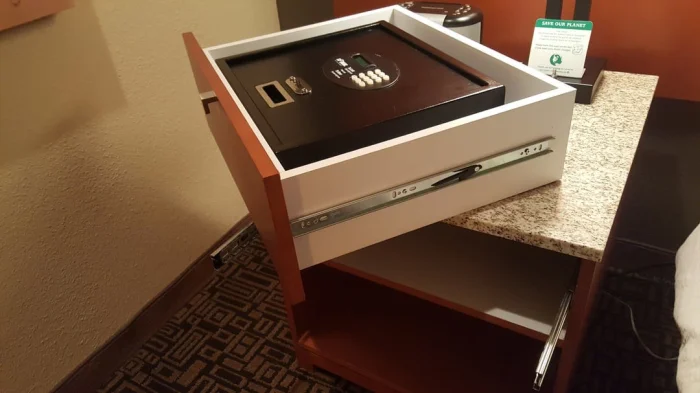 12. Этот сейф в гостиничном номере прикреплен болтами к выдвижному ящику