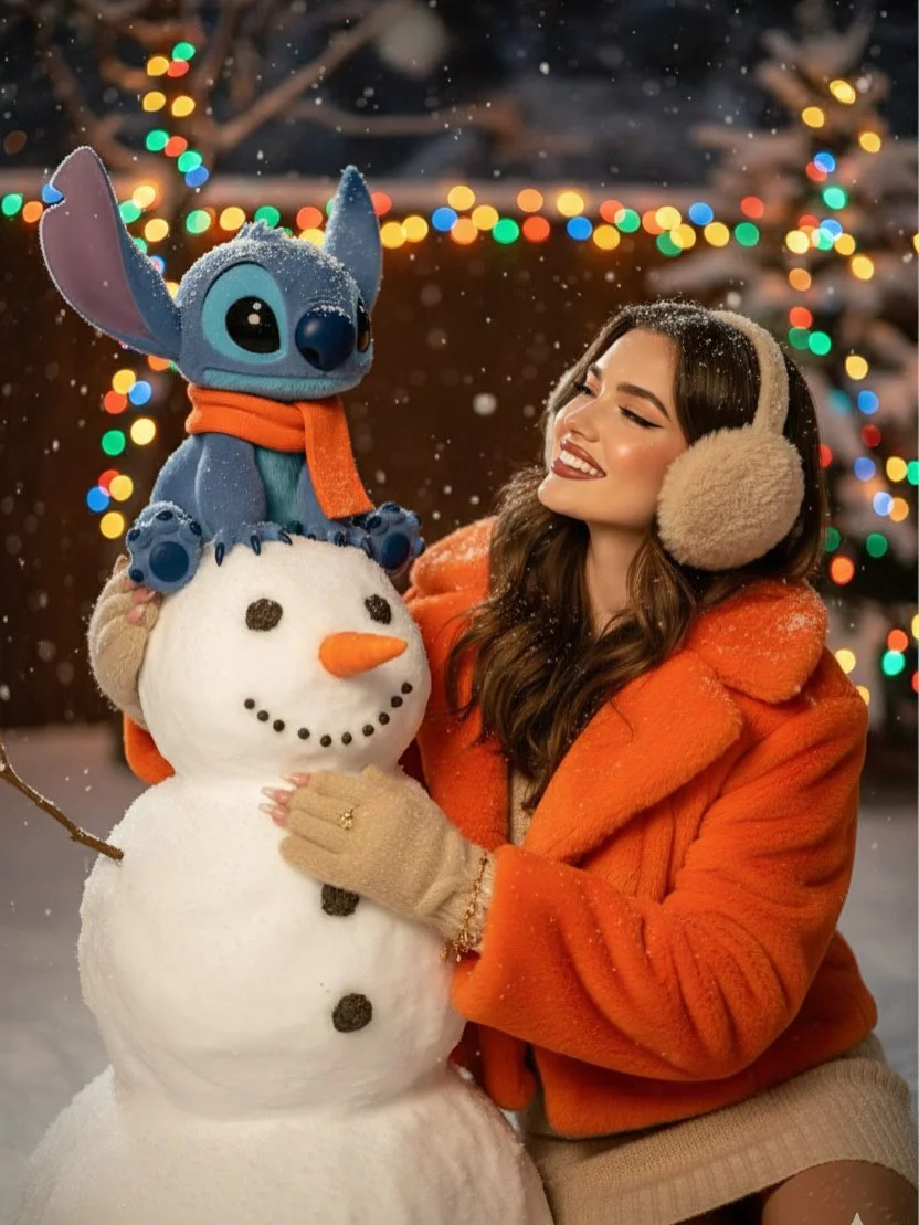 high detail, photorealistic. Focus on eyes, 50–85mm, f/1.8, portrait aspect ratio 2:3. SIN CAMBIAR ROSTRO Y BASANDOTE EN LA FOTO, CREA UNA FOTOGRAFÍA CINEMATOGRÁFICA INVERNAL ULTRAFOTORREALISTA DE UNA JOVEN [REFERENCIA DE LA FOTO] Y STITCH CON TEXTURA DE PIEL REALISTA Y DE ALTO DETALLE: FINA, AFELPADA, ATERCIOPELADA, LIGERAMENTE CUBIERTA DE NIEVE. ESTÁN CONSTRUYENDO UN MUÑECO DE NIEVE JUNTOS EN UN PATIO NEVADO CON LUCES BRILLANTES DE FONDO. LA MUJER LLEVA UN ABRIGO DE PIEL NARANJA BRILLANTE, UN VESTIDO DE PUNTO BEIGE, OREJERAS BEIGE ESPONJOSAS Y MITONES CÁLIDOS. STITCH, CON UNA BUFANDA NARANJA, SE SIENTA ENCIMA DEL MUÑECO DE NIEVE RIENDO JUGUETONAMENTE, SU PELO AZUL REFLEJANDO LA LUZ. CÁLIDAS LUCES CINEMATOGRÁFICAS, GUIRNALDAS DE COLORES, ALEGRE ATMÓSFERA NAVIDEÑA, ESTILO EDITORIAL DE MODA ULTRA DETALLADO