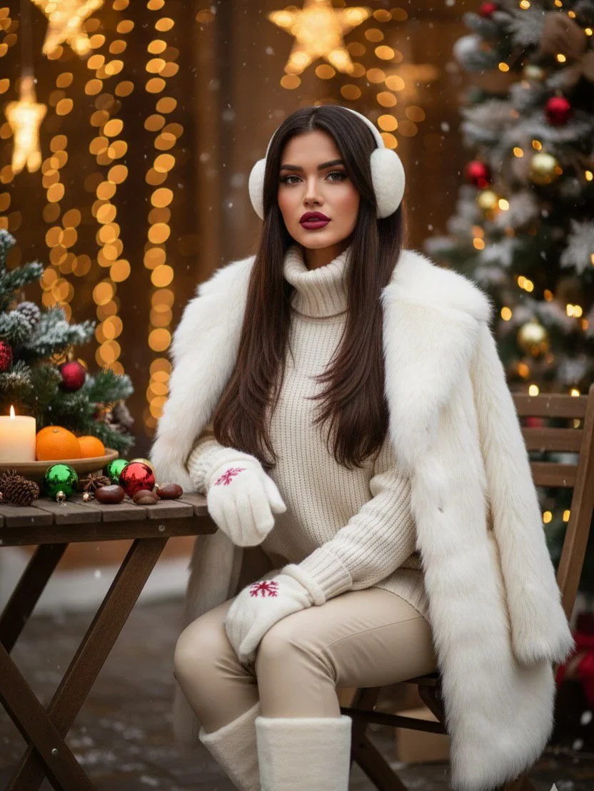 She is wearing a thick-knit cream turtleneck sweater, a fluffy white faux fur coat, white earmuffs, and white knee-high fluffy boots with leather leggings in the same color as the sweater. She has white knit gloves on her hands, adorned with a small red snowflake embroidery or festive design. Her lips are painted with vibrant burgundy lipstick, long, natural black eyelashes with mascara, and cinnamon blush.