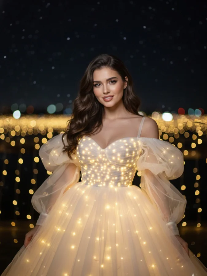 The dress features a fitted bodice with voluminous, sheer puff sleeves that softly drape over the shoulders. The most distinctive element is that the dress is illuminated from within by small golden or warm yellow lights, creating a magical, glowing effect. The bodice contains many of these tiny lights, and the wide, fluffy skirt also emits a soft, radiant glow, giving the impression that the dress itself is alive with light.