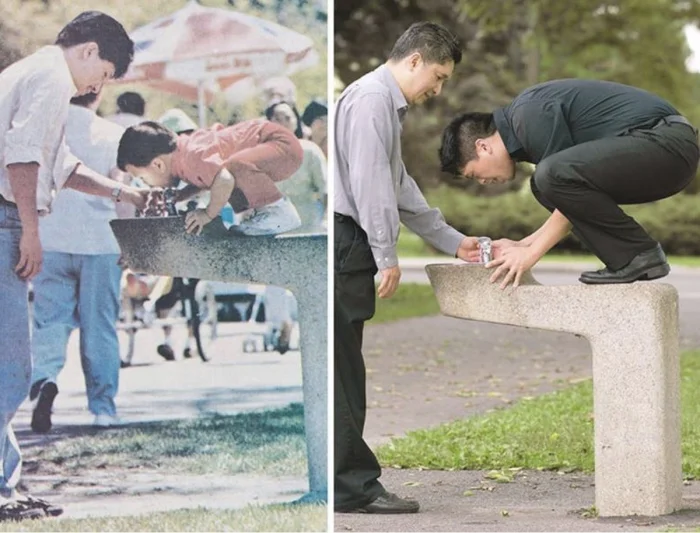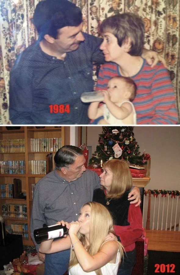 Мало кто может внятно объяснить, зачем их тянет переснимать старые фото, да еще и непременно в тех же позах и одежде. Вроде ностальгия чистой воды, но с другой — до чего же нелепо выглядят дядьки и тетки, когда косплеят младенцев. С другой стороны, в этом и суть, показать, насколько данные персонажи изменились