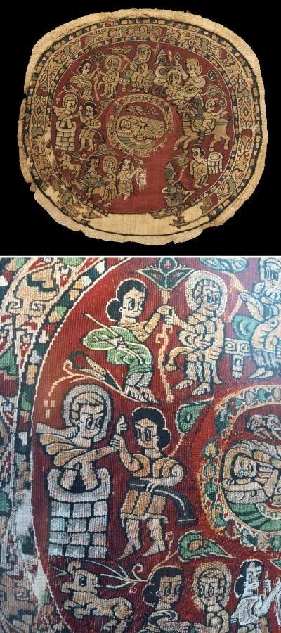 8. Льняной орбикул из Египта, украшенный историей об Иосифе. Слева изображено, как его бросают в колодец, и как брат уносит его разноцветную одежду. Справа измаильтяне увозят Иосифа на верблюде, чтобы продать фараону. 650–699 гг. н. э.