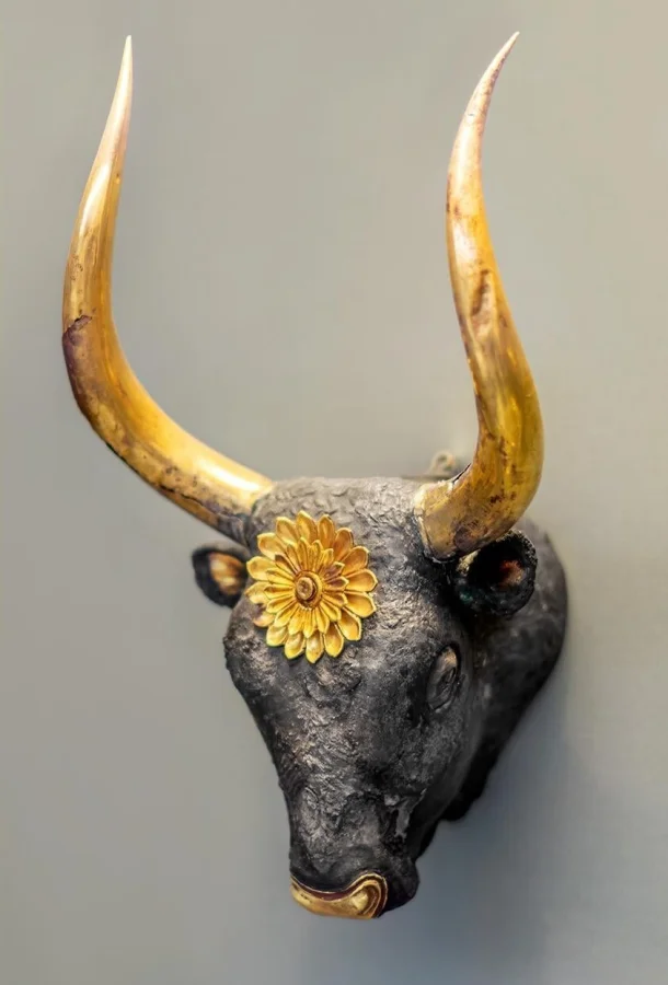 13. Микенский ритон (ритуальный сосуд) в форме головы быка. Сочетая в себе серебро в качестве основы и золотые украшения, он свидетельствует о высочайшем уровне мастеров