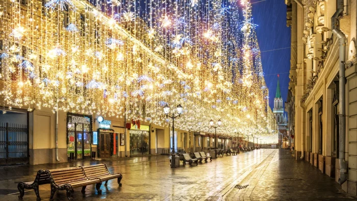 Никольская улица, одна из самых популярных пешеходных зон города, украшенная новогодней иллюминацией