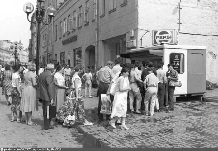 Ну и в завершении ещё одно фото на Арбате. Люди утоляют жажду импортными газированными напитками