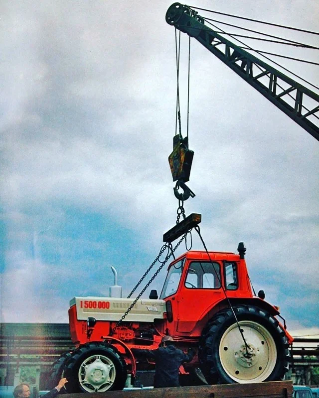 Погрузка на железнодорожную платформу полуторамиллионного трактора Минского тракторного завода - МТЗ-82 в экспортном исполнении. Конец 1970-х гг.
