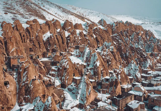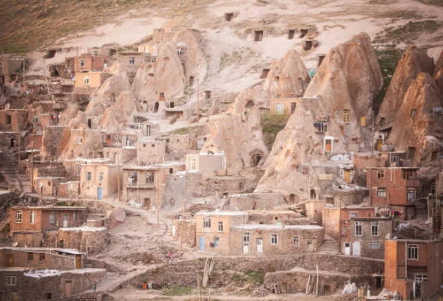Местные жители именуют эти многоуровневые пещеры «караан», и они выступают из склонов горы Сехенд, напоминая гигантский пчелиный улей — природное чудо, дополненное руками человека.