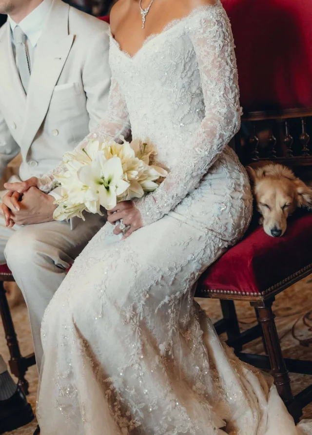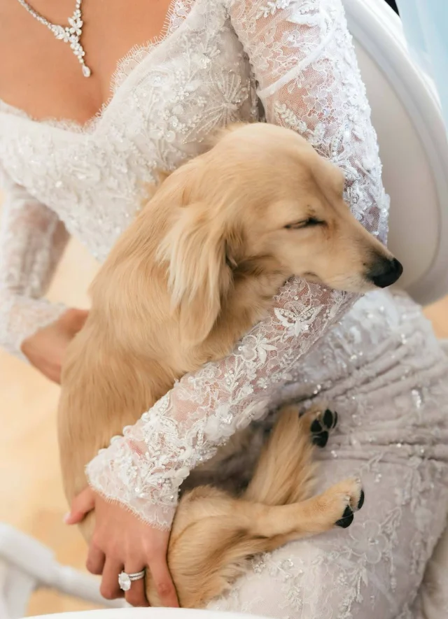 Пёс сумел оказаться почти в каждом кадре свадебной фотосессии — и даже успел отведать свадебный торт, вызвав тёплые улыбки у гостей.