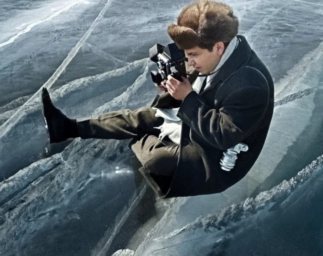 Фотокорреспондент Агентства печати Олег Иванов сидит на льду озера Байкал, 1965 год.