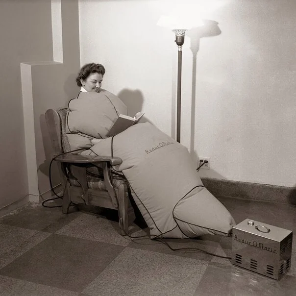 Портативная сауна Reduc-o-matic, которая была популярна в 1940-х годах. Согласно описанию, на тело человека одевали большой матерчатый мешок, а воздушный насос нагнетал в него тепло, что создавало эффект сауны. Считалось, что с помощью такого устройства можно «расплавить» жир.