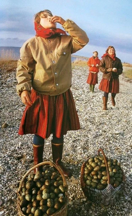 Девушки собирают яйца чаек на небольшом рыбацком острове Кихну, ЭССР, 1980-е годы.