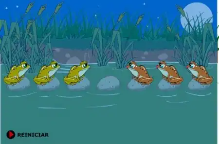 Вам нужно поменять лягушек местам, т.е. три зеленых должны оказаться справа, а 3 коричневых слева.