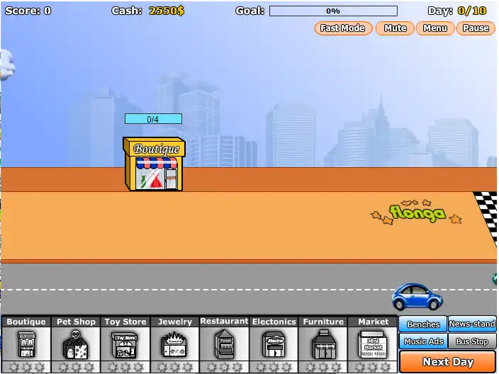 Застрой улицу магазинами, ресторанами, газетными киосками так, чтобы за отведенное количество дней заработать нужную сумму денег. Пусть покупатели уйдут счастливыми и с пустыми карманами!