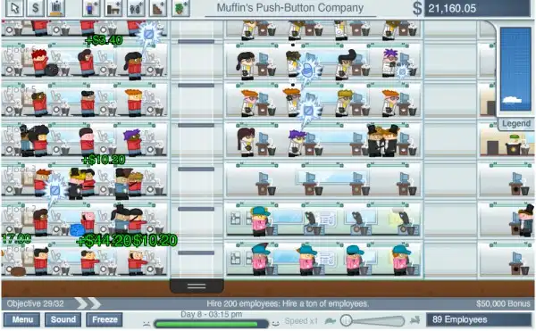 Строим небоскреб, в котором размещается корпорация по нажатию клавиш. Нанимаем разных рабочих для обеспечения комфортного рабочего процесса (их 6 типов). Выполняем поставленные цели, чтобы получить дополнительный доход. Всего целей 32, задача выполнить их все за как можно меньшее количество дней)