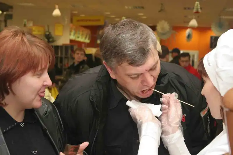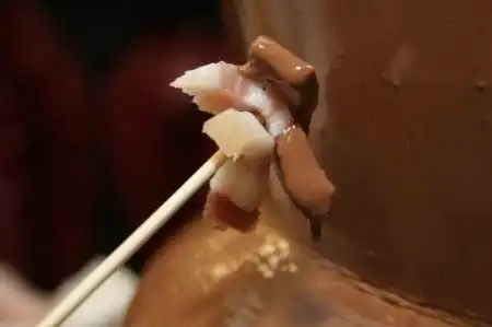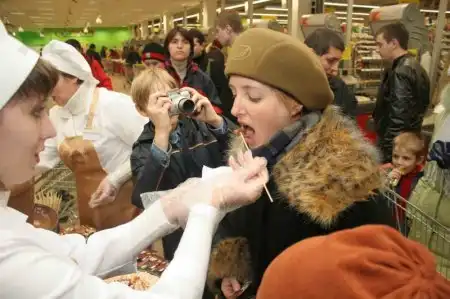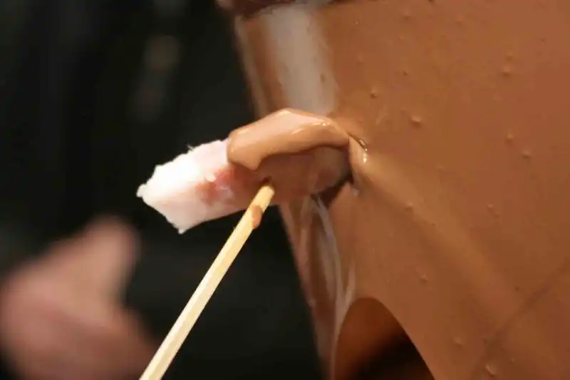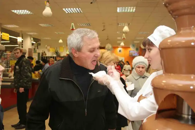 На прошедших выходных в Донецке в течении двух дней посетители супермаркетов «Амстор» имели возможность отведать уникальный деликатес – сало в шоколаде. Технология проведения акции, разработанной агентством «Хорошая мысль» по заказу «Агентства Успешных Событий», была продумана таким образом, что ломтики свежайшего сала окунались в поток шоколада, циркулирующего в специальной каскадной установке – шоколадном Фонтане. Несмотря на достаточную специфичность и экзотичность сочетаний дегустируемых продуктов, акция вызвала высочайший интерес у дончан и гостей города. Всего за два дня дегустации было залито шоколадом около 42 кг сала. Среди предложенных участникам акции пяти сортов «украинского национального продукта» - традиоционного соленого, маринованного с прорезью, запеченного с перцем, копченого и грудинки, особой популярностью пользовалось копченое сало в шоколаде, общий расход которого составил более 15 кг. По подсчетам организаторов, которые проводились по одноразовым шпажкам и вилкам, непосредственное участие в дегустации приняло 3523 человека! Интересно отметить, что все 100% участников акции пробовали этот деликатес впервые в жизни и большая часть отмечала изысканность сочетания этих, казалось бы, несовместимых продуктов. По мнению многих участников этой необычной дегустации, особый вкус салу предавал высококачественный бельгийский шоколад, который специально разработан для шоколадных Фонтанов.